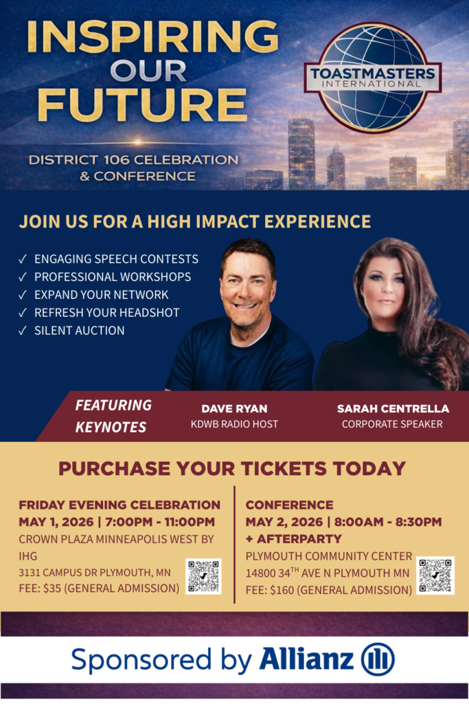 Allianz is proud to partner with District 106 Toastmasters, empowering leaders across Minnesota and Ontario to communicate with confidence and purpose. Their generous Gold Tier sponsorship helps make this event possible. Click here to learn more about Allianz